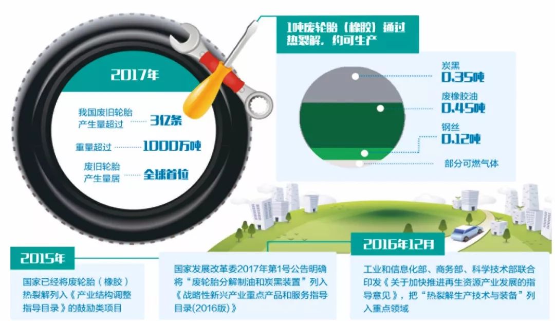 2015年,國(guó)家已經(jīng)將廢輪胎(橡膠)熱裂解列入《產(chǎn)業(yè)結(jié)構(gòu)調(diào)整指導(dǎo)目錄》的鼓勵(lì)類項(xiàng)目。國(guó)家發(fā)展改革委2017年第1號(hào)公告明確將“廢輪胎分解制油和炭黑裝置”列入《戰(zhàn)略性新興產(chǎn)業(yè)重點(diǎn)產(chǎn)品和服務(wù)指導(dǎo)目錄(2016版)》,2016年12月份,工業(yè)和信息化部、商務(wù)部、科學(xué)技術(shù)部聯(lián)合印發(fā)《關(guān)于加快推進(jìn)再生資源產(chǎn)業(yè)發(fā)展的指導(dǎo)意見》,把“熱裂解生產(chǎn)技術(shù)與裝備”列入重點(diǎn)領(lǐng)域。