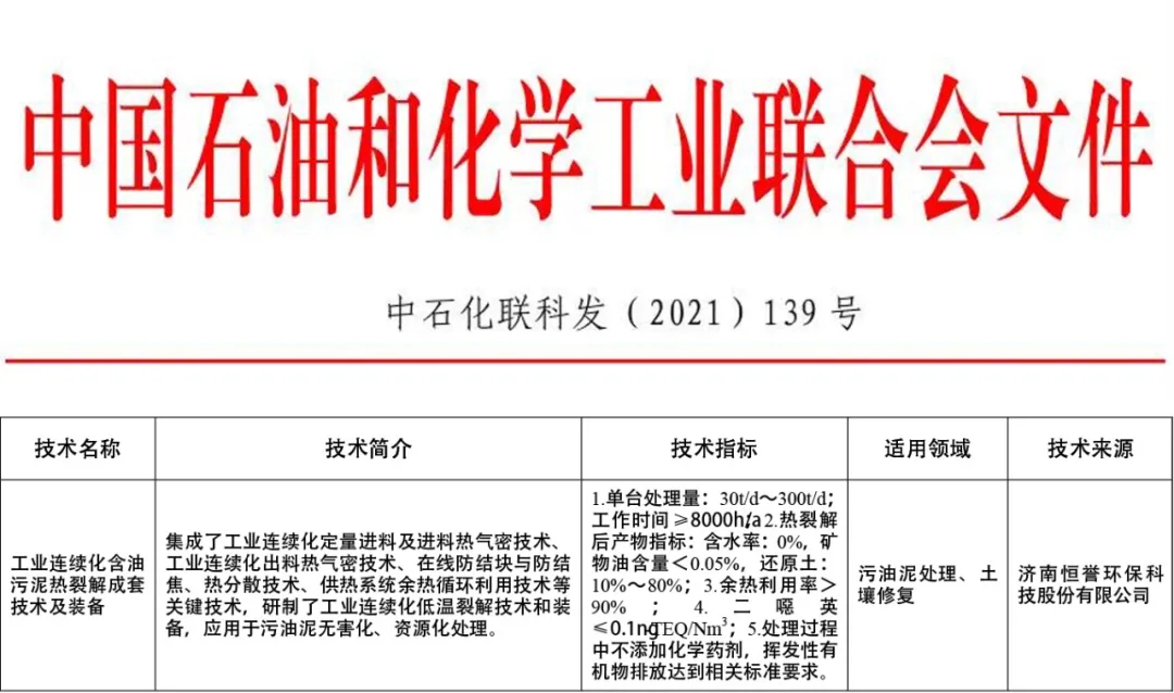 為促進我國產(chǎn)業(yè)結(jié)構(gòu)調(diào)整,培育戰(zhàn)略性新興產(chǎn)業(yè),深入貫徹黨的十九屆五中全會精神,按照“2021年全國科技工作會議”要求,推動行業(yè)關(guān)鍵技術(shù)研發(fā)和科技成果轉(zhuǎn)化,促進新技術(shù)產(chǎn)業(yè)化和規(guī)模化應用,經(jīng)專家論證、篩選后,中國石油和化學工業(yè)聯(lián)合會公布了《2021年度中國石油和化學工業(yè)聯(lián)合會科技指導計劃》(以下簡稱“指導計劃”)。濟南恒譽環(huán)保科技股份有限公司自主研發(fā)的“工業(yè)連續(xù)化含油污泥熱裂解成套技術(shù)及裝備”入選推廣類節(jié)能環(huán)保項目,后期,部分重點項目聯(lián)合會將推薦給國家有關(guān)部門列入相關(guān)科技研發(fā)計劃或技術(shù)推廣目錄。
