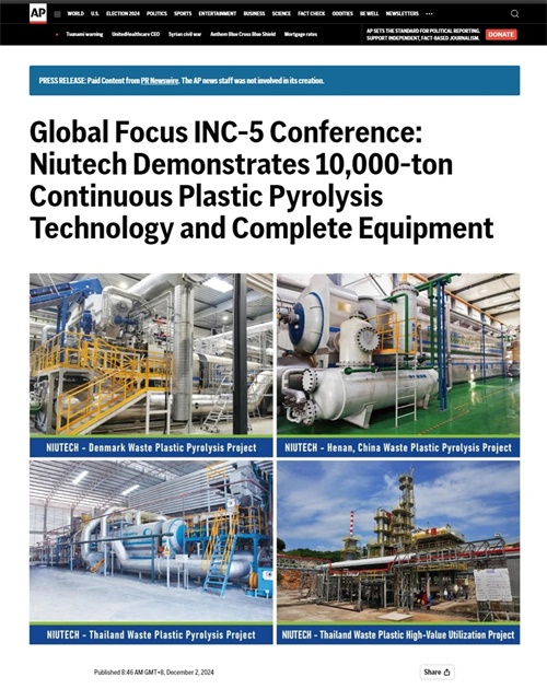 第五屆政府間塑料污染談判委員會(INC-5)在INC-5會議期間,美國最大的通訊社,將關(guān)注重點(diǎn)從會場內(nèi)轉(zhuǎn)向會場外,,并以“Niutech Demonstrates 10,000-ton Continuous Plastic Pyrolysis Technology and Complete Equipment”為題,報道了恒譽(yù)環(huán)保在丹麥、泰國、韓國及中國本土,持續(xù)穩(wěn)定運(yùn)行數(shù)年的多個。“全球廢塑料污染治理,離不開先進(jìn)技術(shù)的支撐,其中來自中國的恒譽(yù)環(huán)保,,安全環(huán)保地將廢塑料變?yōu)樵偕Y源產(chǎn)品,減少了環(huán)境污染的同時,為經(jīng)濟(jì)綠色發(fā)展做出貢獻(xiàn),為全球廢塑料污染治理提供了示范案例。